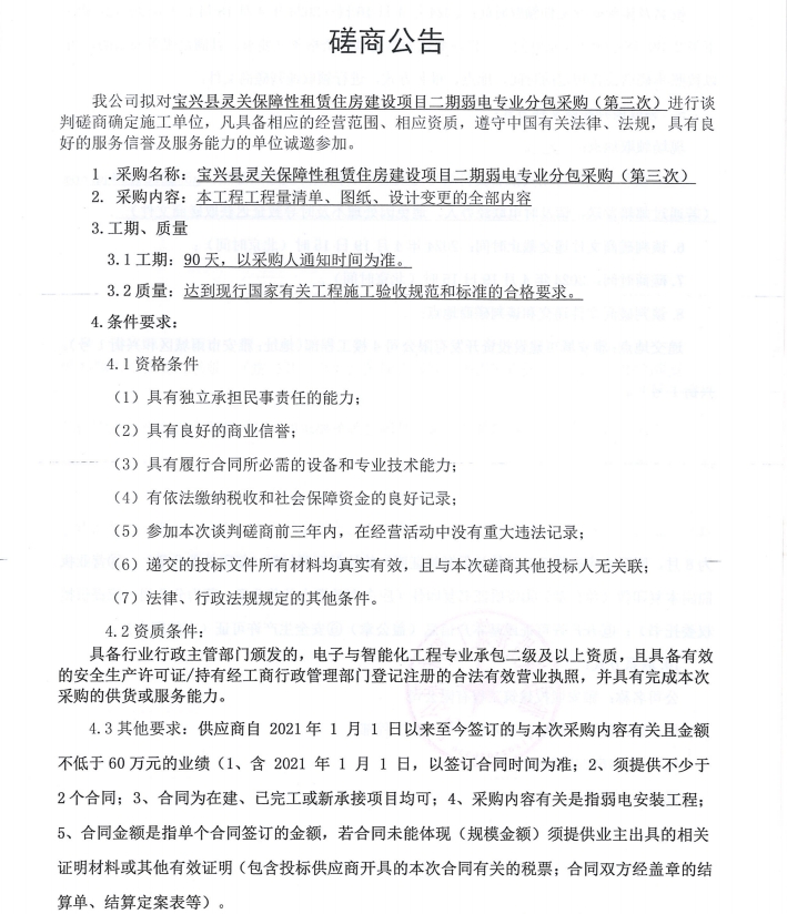 寶興縣靈關(guān)保障性租賃住房建設(shè)項(xiàng)目二期弱電工程專業(yè)分包采購(第三次)磋商公告