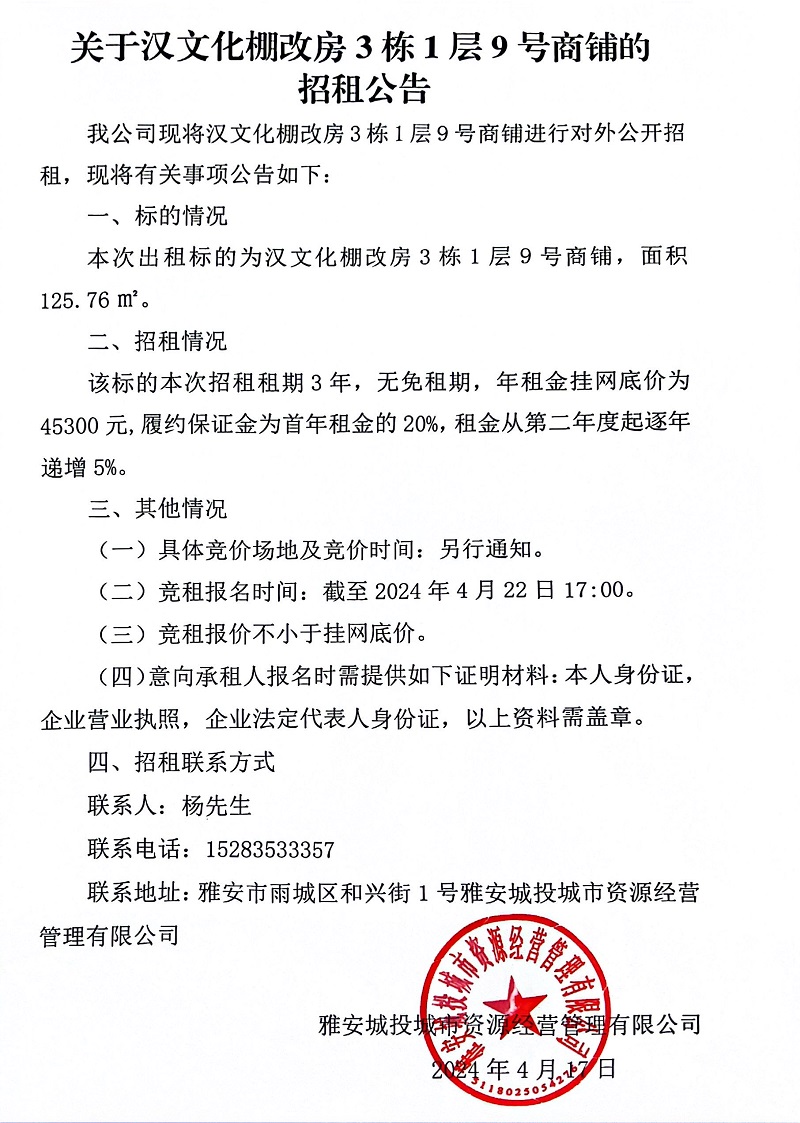 關(guān)于漢文化棚改房3棟1層9號(hào)商鋪的招租公告