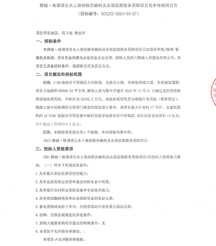 雅城·格調(diào)項(xiàng)目水土保持報(bào)告編制及水保監(jiān)測服務(wù)采購項(xiàng)目競爭性磋商公告