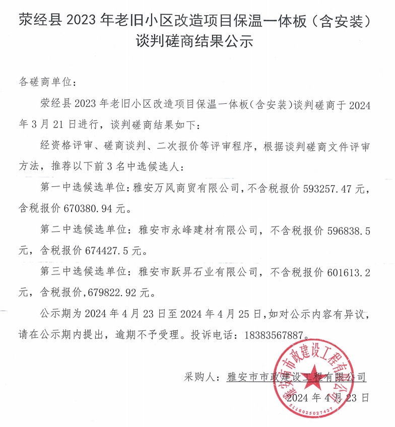 滎經(jīng)縣2023年老舊小區(qū)改造項目保溫一體板(含安裝)談判磋商結(jié)果公示
