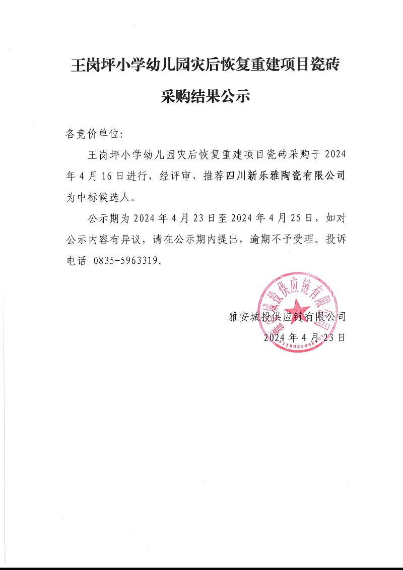 王崗坪小學(xué)幼兒園災(zāi)后恢復(fù)重建項(xiàng)目瓷磚采購結(jié)果公示