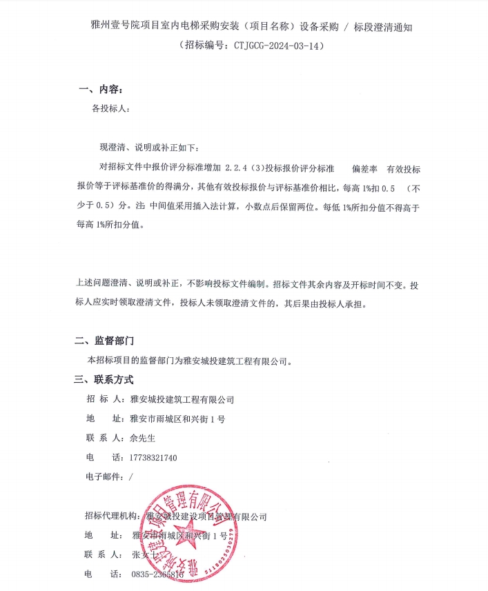 雅州壹號院項目室內電梯采購安裝(項目名稱)設備采購/標段澄清通知