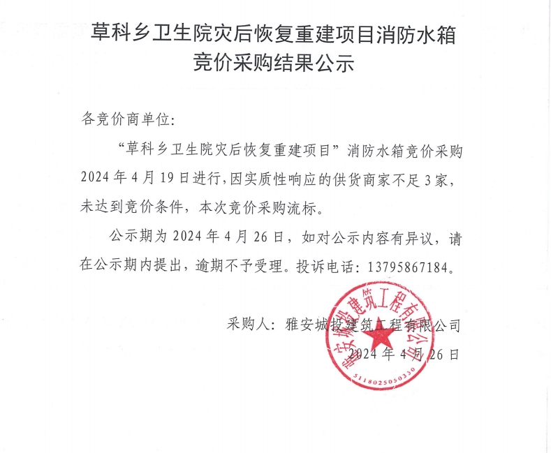 草科鄉(xiāng)衛(wèi)生院災(zāi)后恢復(fù)重建項(xiàng)目消防水箱競價(jià)采購結(jié)果公示