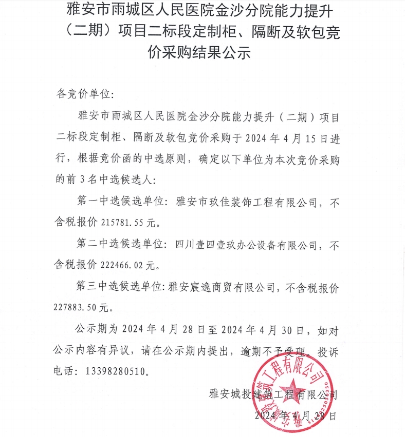 雅安市雨城區(qū)人民醫(yī)院金沙分院能力提升(二期)項目二標段定制柜、隔斷及軟包競價采購結(jié)果公示