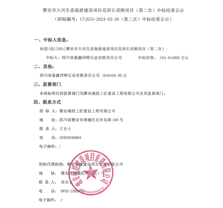 雅安市大興生態(tài)旅游建設(shè)項(xiàng)目花崗石采購項(xiàng)目(第二次)中標(biāo)結(jié)果公示