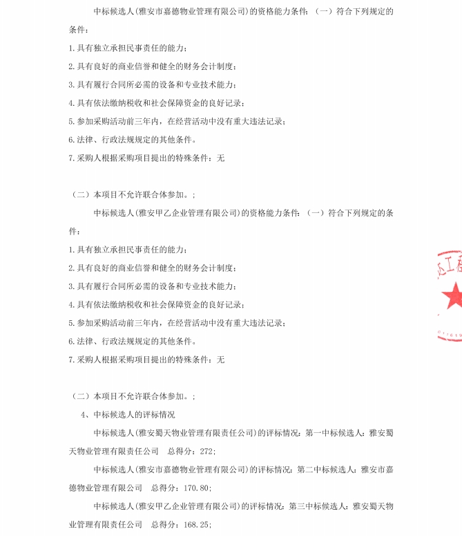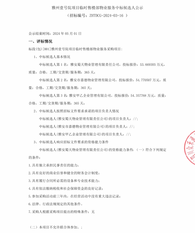 雅州壹號(hào)院臨時(shí)售樓部物業(yè)服務(wù)中標(biāo)候選人公示