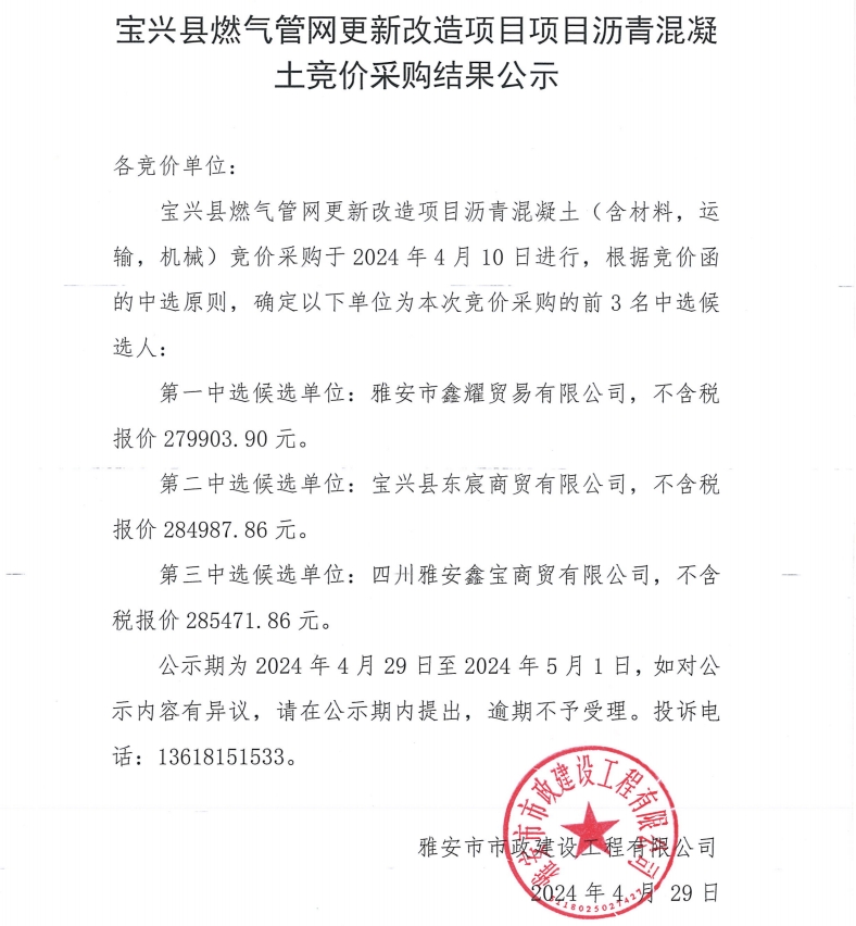 寶興縣燃?xì)夤芫W(wǎng)更新改造項(xiàng)目瀝青混凝土競價(jià)采購結(jié)果公示
