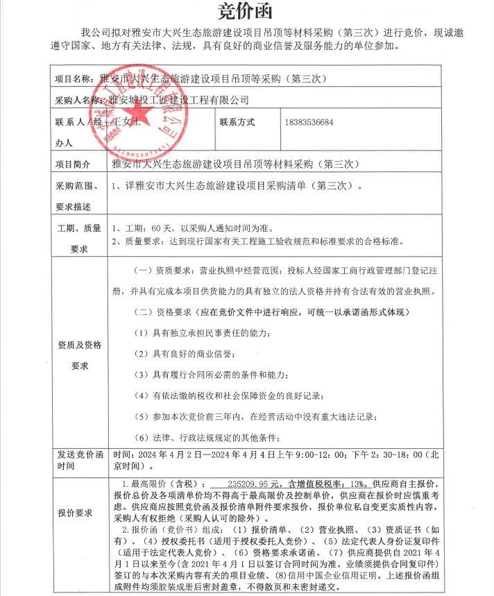 雅安市大興生態(tài)旅游建設(shè)項(xiàng)目吊頂?shù)炔牧喜少?gòu)(第三次)競(jìng)價(jià)公告