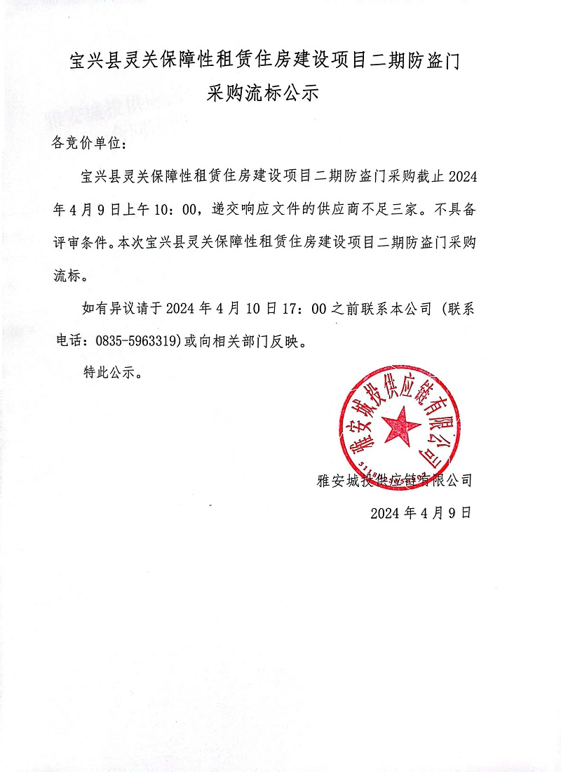 寶興縣靈關(guān)保障性租賃住房建設項目二期防盜門采購流標公示
