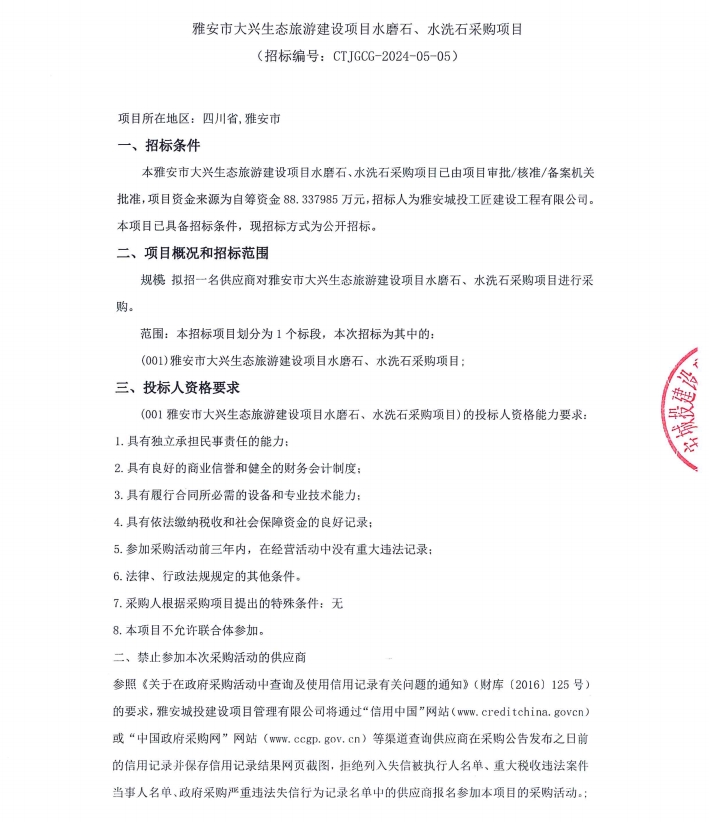 雅安市大興生態(tài)旅游建設項目水磨石、水洗石采購項目公告