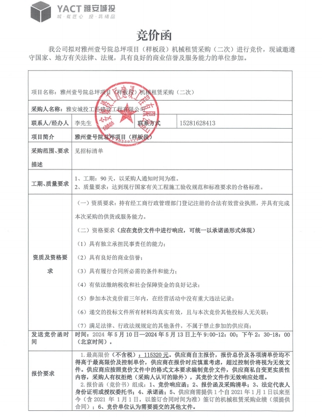 雅州壹號(hào)院總坪項(xiàng)目(樣板段)機(jī)械租賃采購(二次)競價(jià)公告