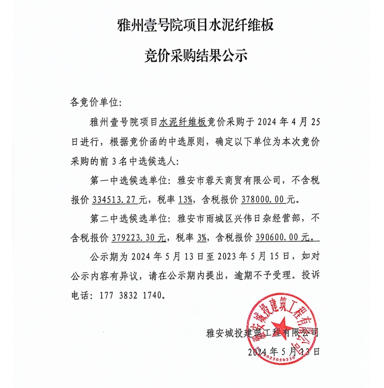 雅州壹號(hào)院項(xiàng)目水泥纖維板競(jìng)價(jià)采購(gòu)結(jié)果公示