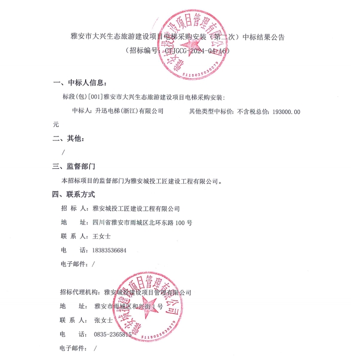雅安市大興生態(tài)旅游建設項目電梯采購安裝(第二次)中標結果公告