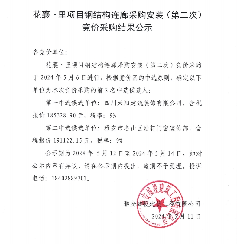 花襄·里項(xiàng)目鋼結(jié)構(gòu)連廊采購安裝(第二次)競(jìng)價(jià)采購結(jié)果公示