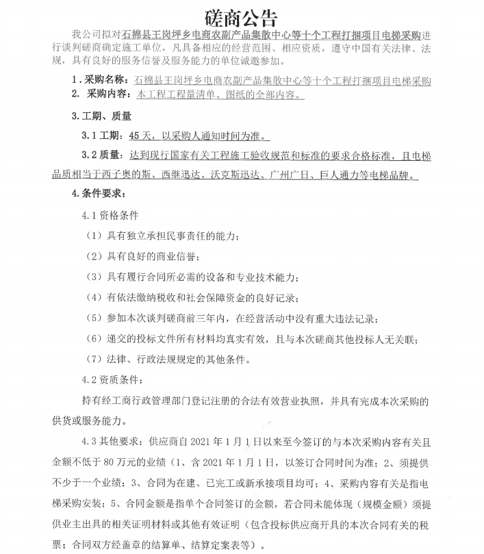 石棉縣王崗坪鄉(xiāng)電商農(nóng)副產(chǎn)品集散中心等十個工程打捆項(xiàng)目電梯采購磋商公告
