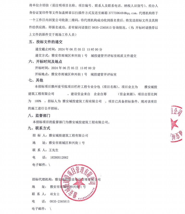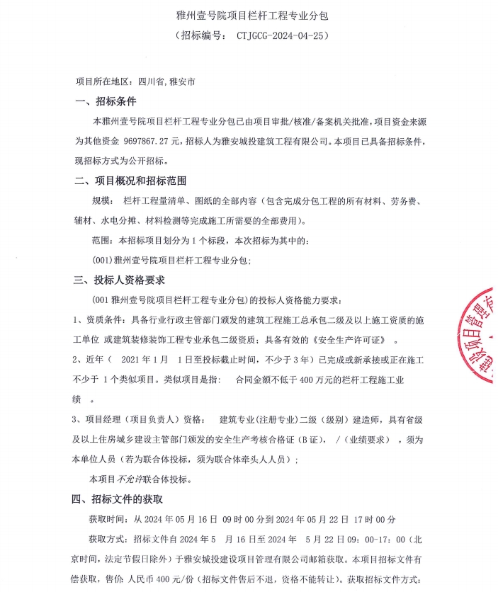 雅州壹號院項(xiàng)目欄桿工程專業(yè)分包采購公告