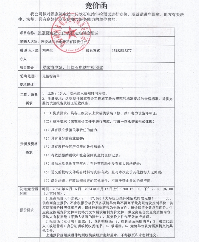 羅家灣電站、門(mén)坎石電站年檢預(yù)試競(jìng)價(jià)公告