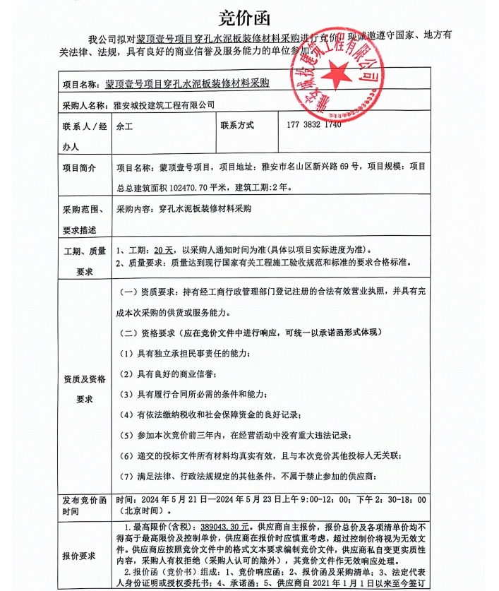蒙頂壹號(hào)項(xiàng)目穿孔水泥板裝修材料采購(gòu)競(jìng)價(jià)公告