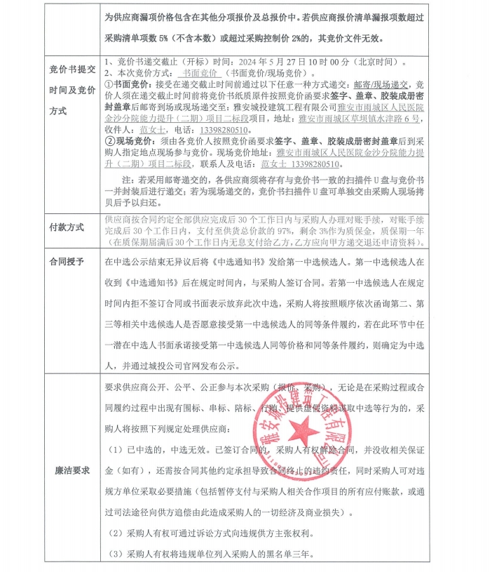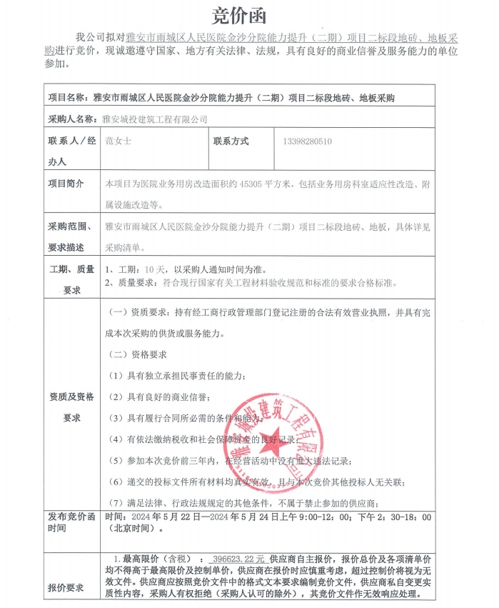 雅安市雨城區(qū)人民醫(yī)院金沙分院能力提升(二期)項目二標段地磚、地板采購競價公告