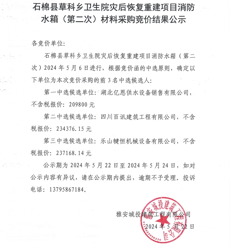 石棉縣草科鄉(xiāng)衛(wèi)生院災后恢復重建項目消防水箱(第二次)材料采購競價結(jié)果公示
