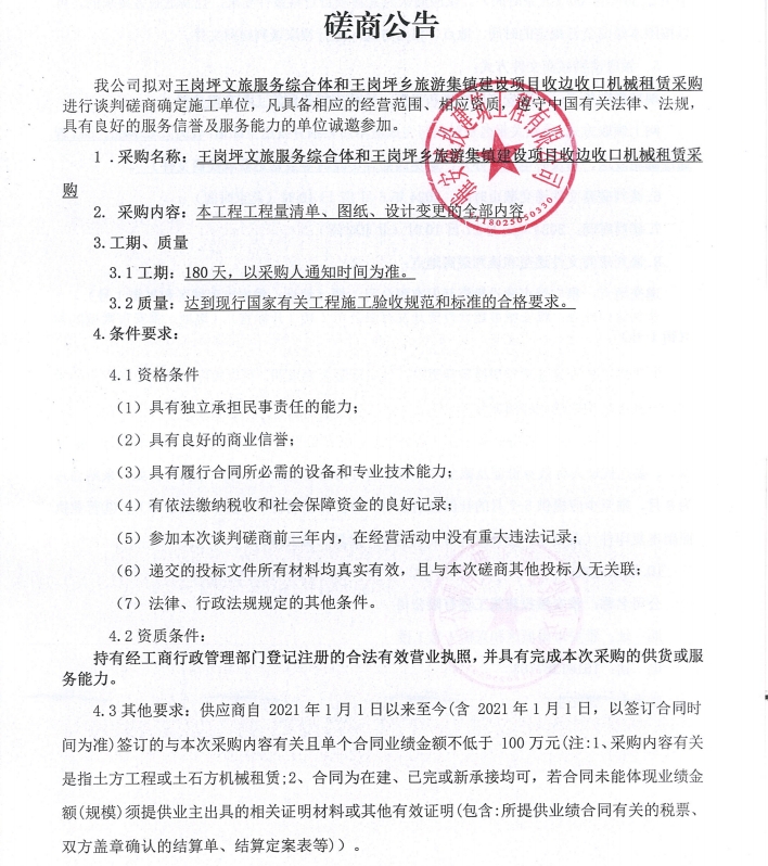 王崗坪文旅服務(wù)綜合體和王崗坪鄉(xiāng)旅游集鎮(zhèn)建設(shè)項(xiàng)目收邊收口機(jī)械租賃采購(gòu)談判磋商公告