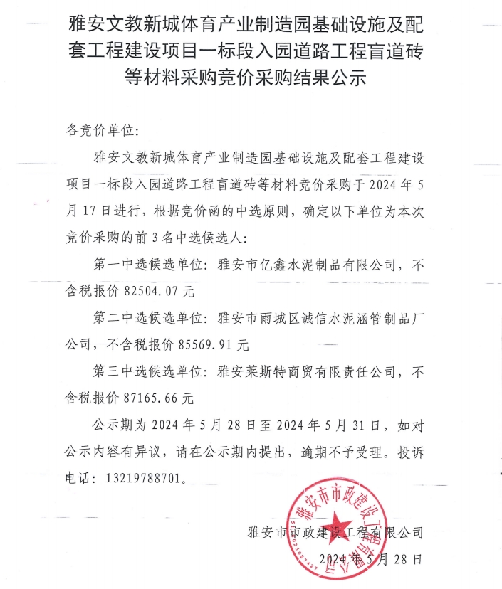 雅安文教新城體育產業(yè)制造園基礎設施及配套工程建設項目一標段入園道路工程盲道磚等材料采購競價采購結果公示