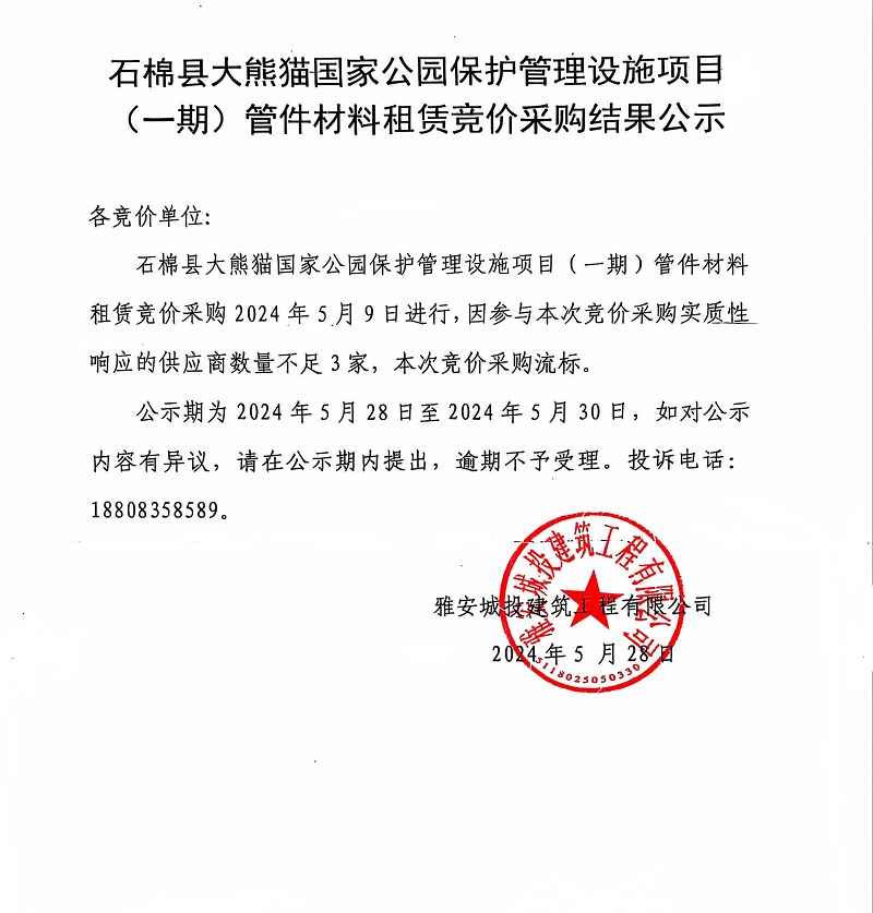 石棉縣大熊貓國家公園保護管理設(shè)施項目(一期)管件材料租賃競價采購結(jié)果公示