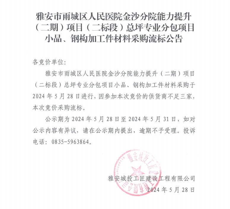 雅安市雨城區(qū)人民醫(yī)院金沙分院能力提升(二期)項目(二標段)總坪專業(yè)分包項目小品、鋼構(gòu)加工件材料采購流標公告