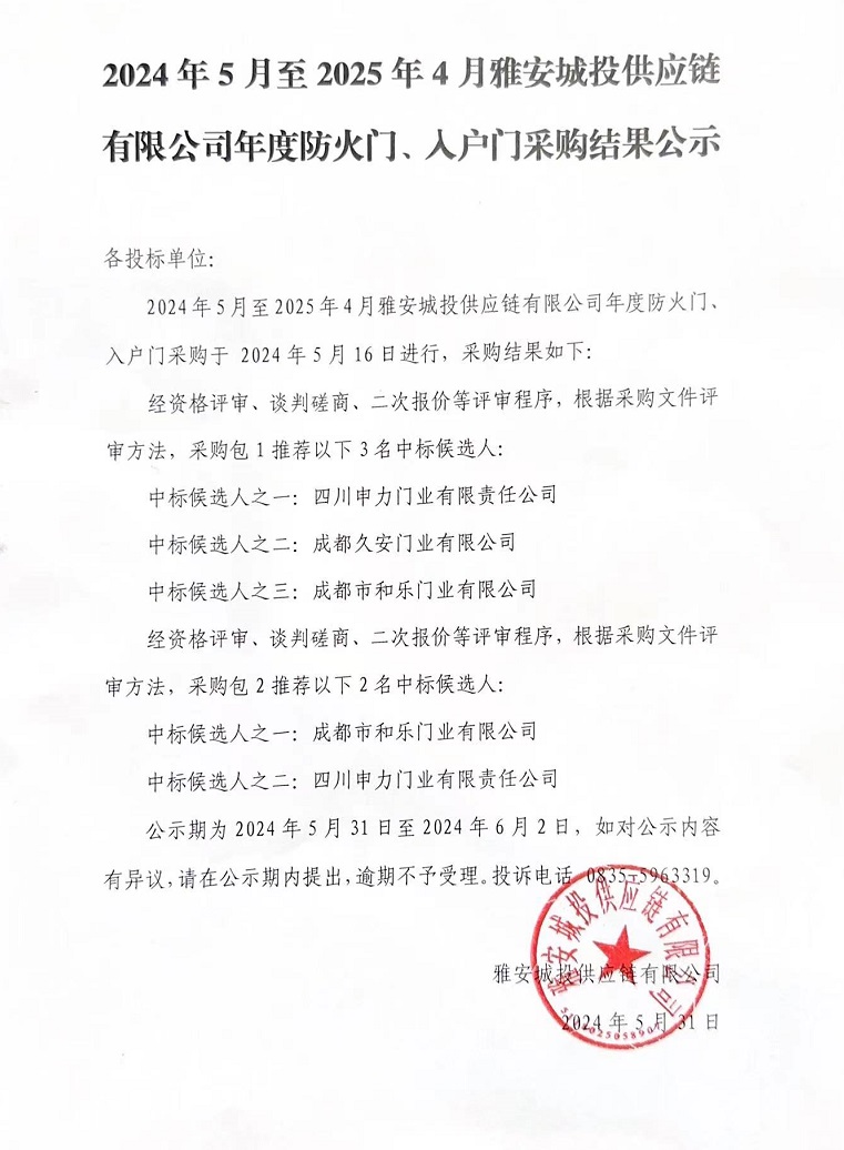 2024年5月至2025年4月雅安城投供應(yīng)鏈有限公司年度防火門、入戶門采購(gòu)結(jié)果公示
