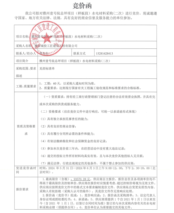 雅州壹號(hào)院總坪項(xiàng)目(樣板段)水電材料采購(二次)競價(jià)公告