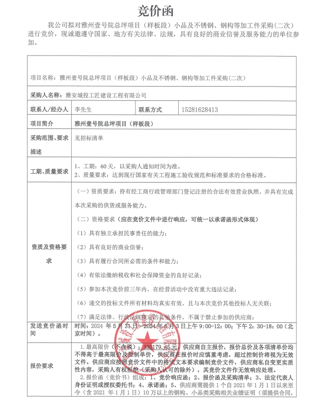雅州壹號(hào)院總坪項(xiàng)目(樣板段)小品及不銹鋼、鋼構(gòu)等加工件采購(二次)競(jìng)價(jià)公告