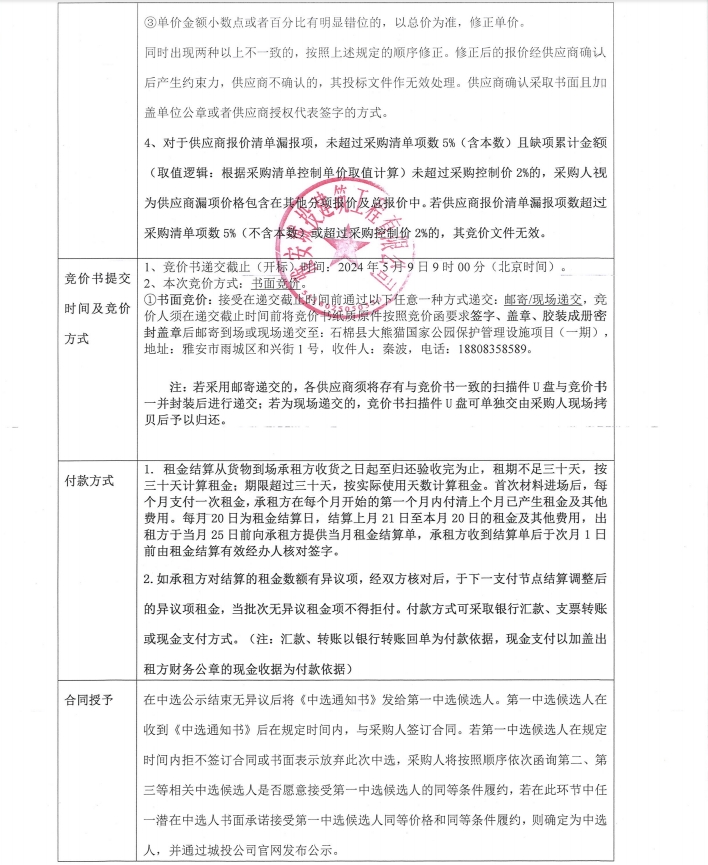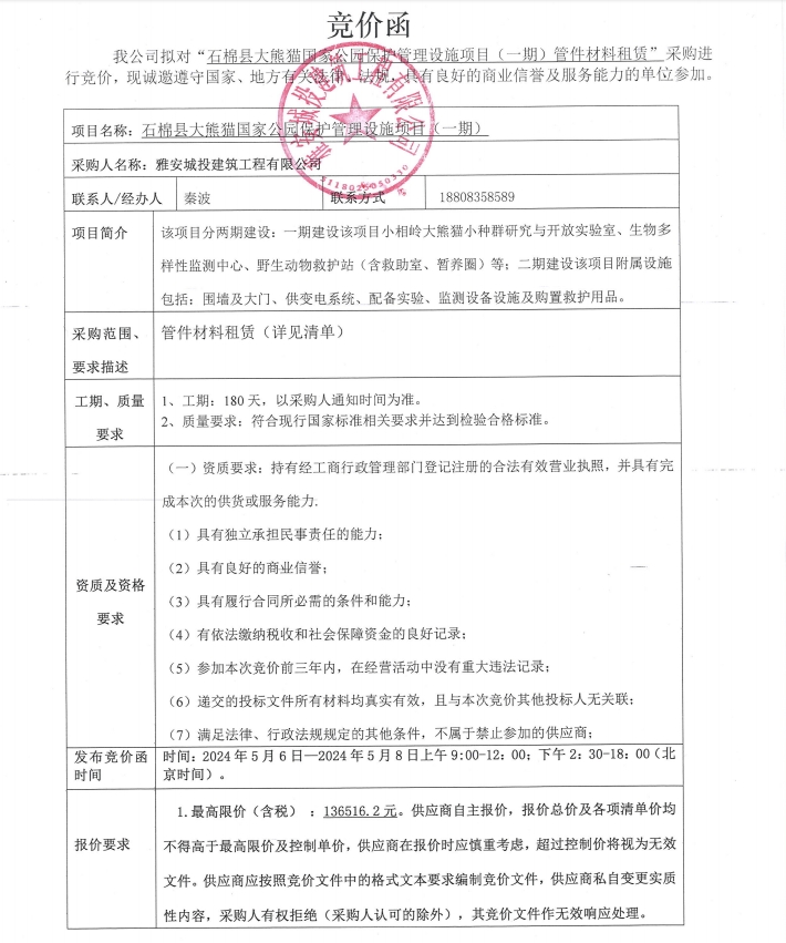 石棉縣大熊貓國家公園保護管理設施項目(一期)管件材料租賃采購競價公告