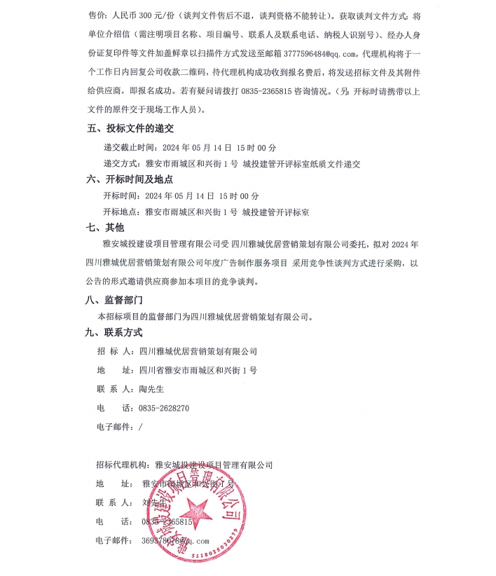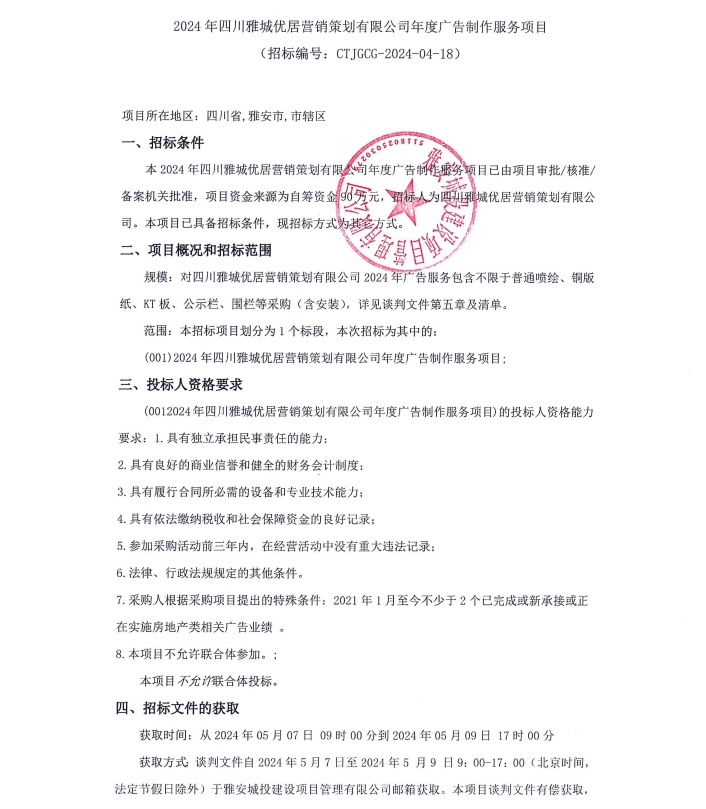 2024年四川雅城優(yōu)居營(yíng)銷策劃有限公司年度廣告制作服務(wù)項(xiàng)目公告