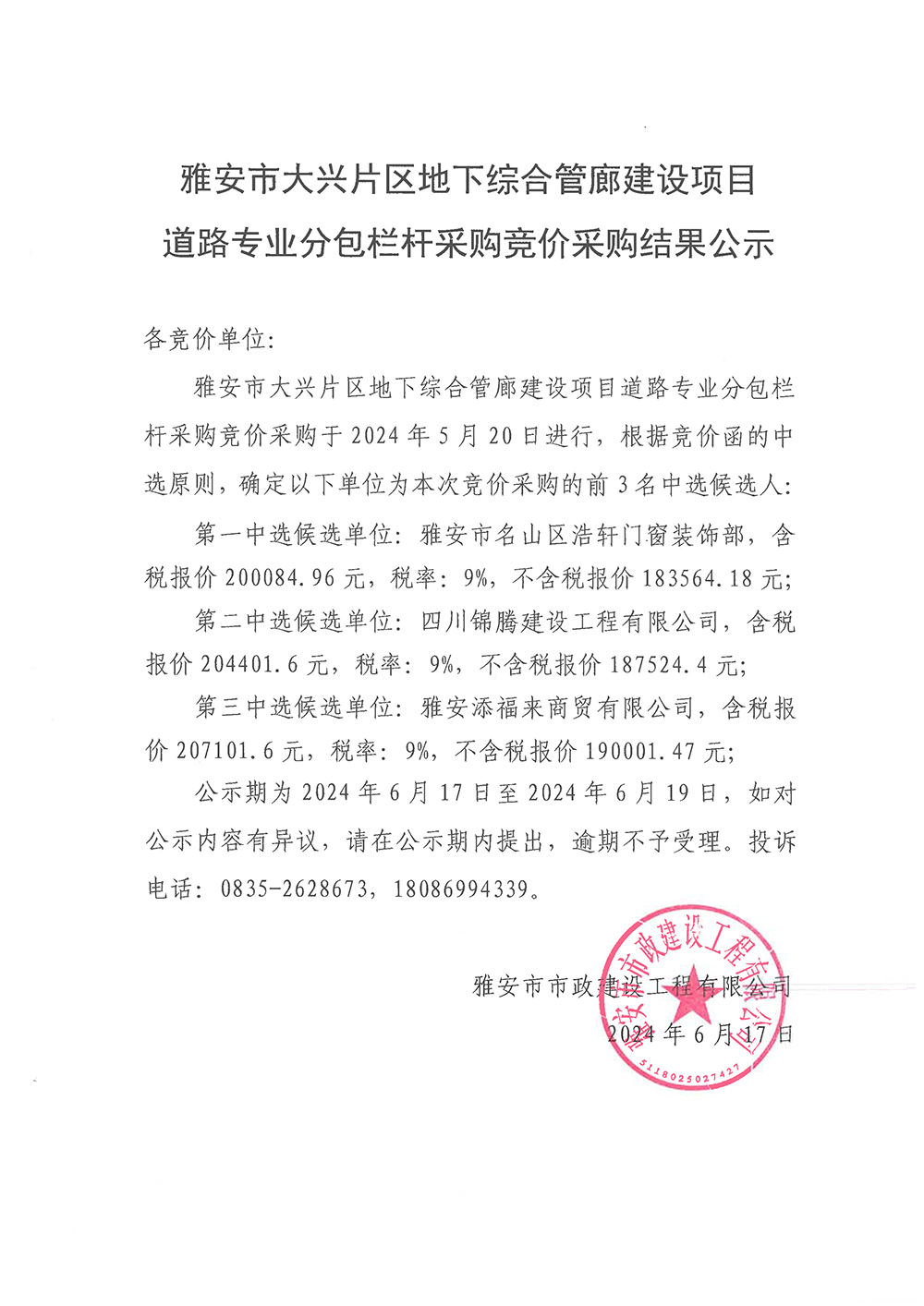 雅安市大興片區(qū)地下綜合管廊建設(shè)項(xiàng)目道路專業(yè)分包欄桿采購競價(jià)采購結(jié)果公示