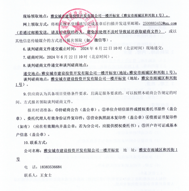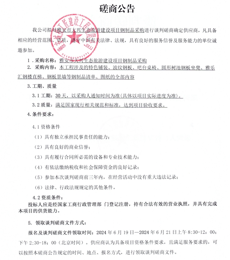 雅安市大興生態(tài)旅游建設(shè)項目鋼制品采購談判磋商公告