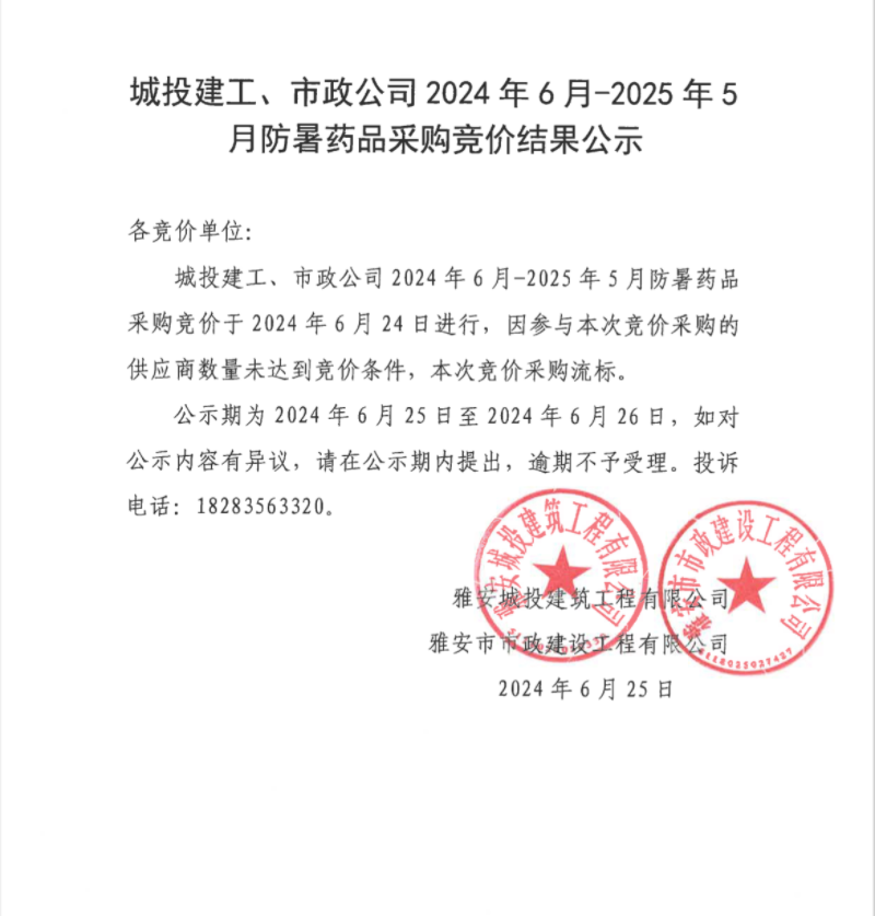 城投建工、市政公司2024年6月-2025年5月防暑藥品采購(gòu)競(jìng)價(jià)結(jié)果公示