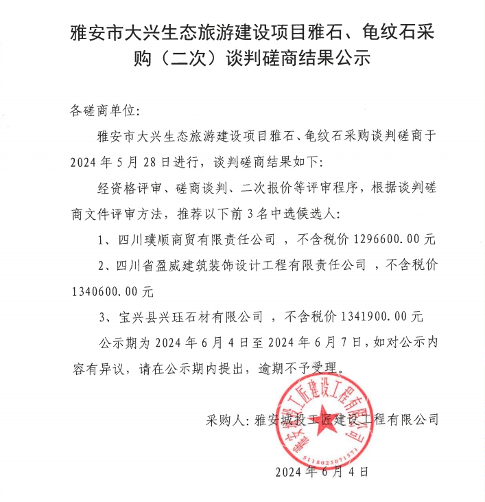 雅安市大興生態(tài)旅游建設(shè)項(xiàng)目雅石、龜紋石采購(二次)談判磋商結(jié)果公示