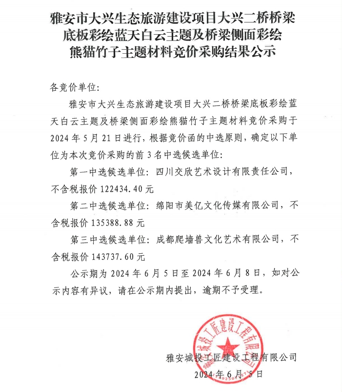 雅安市大興生態(tài)旅游建設項目大興二橋橋梁底板彩繪藍天白云主題及橋梁側面彩繪熊貓竹子主題材料采購結果公示