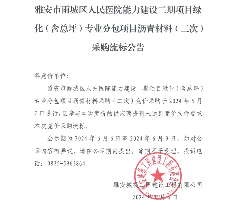 雅安市雨城區(qū)人民醫(yī)院能力建設(shè)二期項(xiàng)目綠化(含總坪)專業(yè)分包項(xiàng)目瀝青材料(二次)采購(gòu)流標(biāo)公告