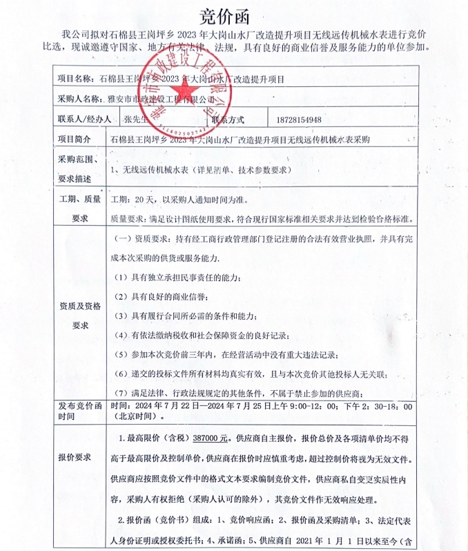 2023年大崗山水廠改造提升項目無線遠傳機械水表競價函