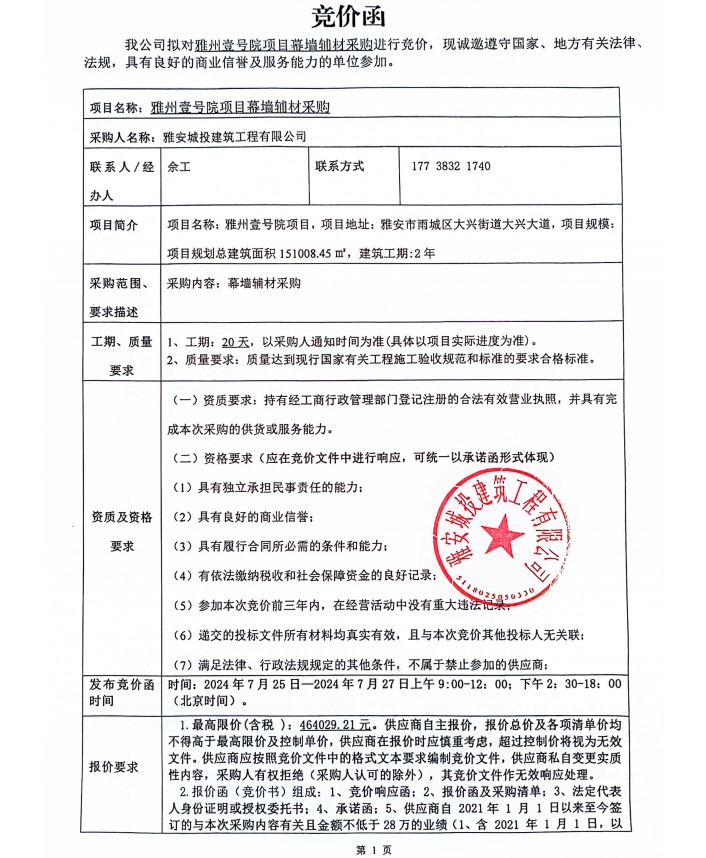 雅州壹號院項目幕墻輔材采購競價公告