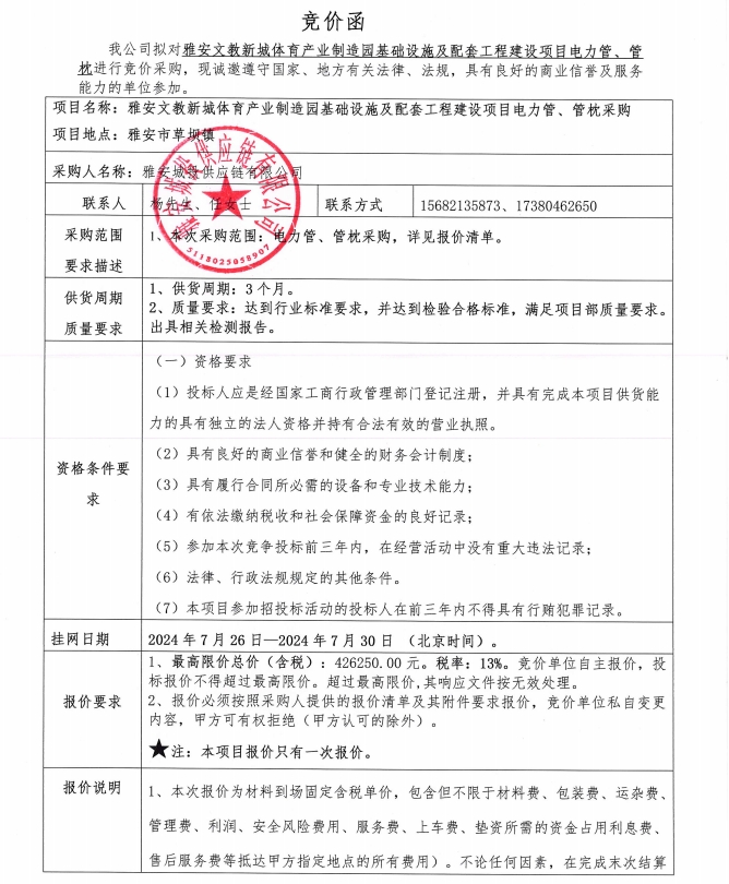 雅安文教新城體育產(chǎn)業(yè)制造園基礎(chǔ)設(shè)施及配套工程建設(shè)項目電力管、管枕采購競價公告