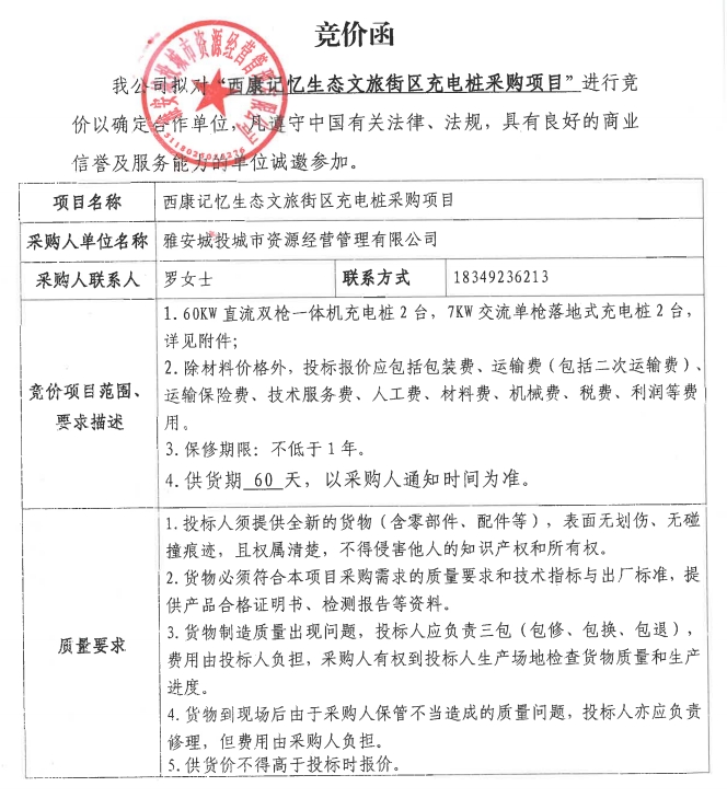 雅安城投城市資源經(jīng)營(yíng)管理有限公司西康記憶生態(tài)文旅街區(qū)充電樁采購(gòu)項(xiàng)目競(jìng)價(jià)公告