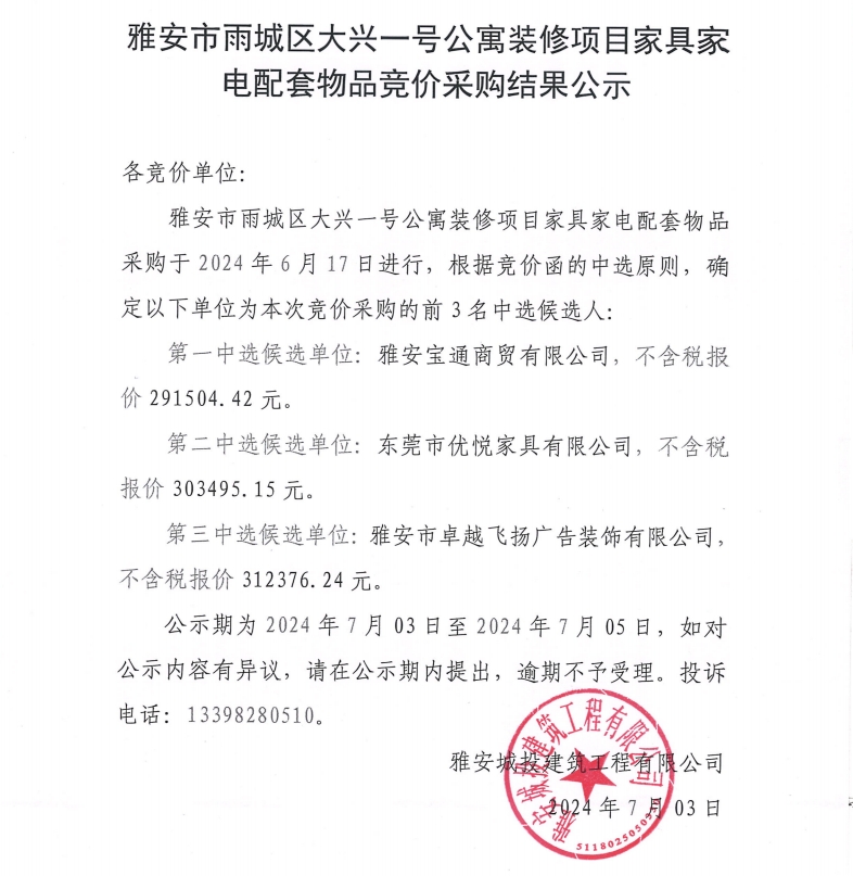 雅安市雨城區(qū)大興一號(hào)公寓裝修項(xiàng)目家具家電配套物品競價(jià)采購結(jié)果公示
