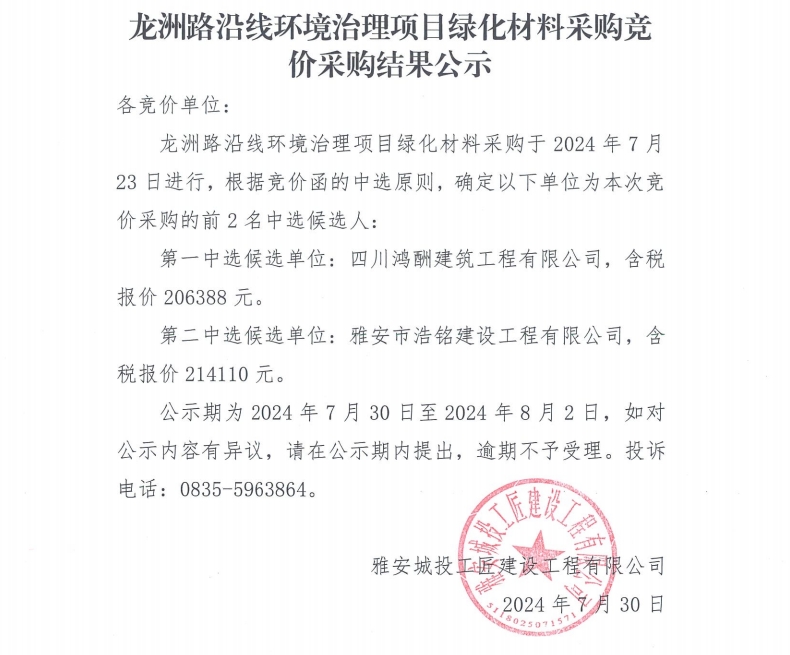 龍洲路沿線環(huán)境治理項目綠化材料采購競價采購結果公示