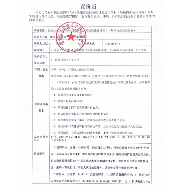 石棉縣王崗坪AAAA級旅游景區(qū)基礎設施建設項目(場鎮(zhèn)內部基礎設施)路燈采購競價公告
