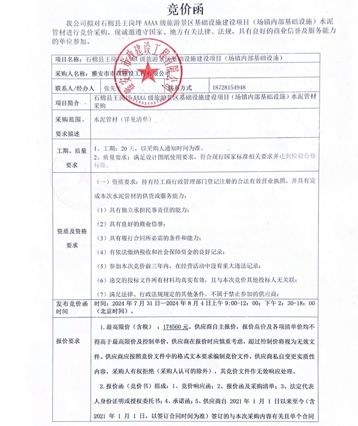石棉縣王崗坪AAAA級(jí)旅游景區(qū)基礎(chǔ)設(shè)施建設(shè)項(xiàng)目(場(chǎng)鎮(zhèn)內(nèi)部基礎(chǔ)設(shè)施)水泥管材采購(gòu)競(jìng)價(jià)公告