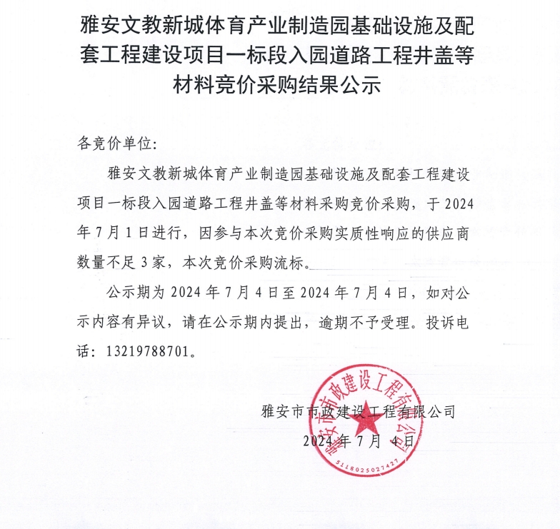 雅安文教新城體育產(chǎn)業(yè)制造園基礎(chǔ)設(shè)施及配套工程建設(shè)項(xiàng)目一標(biāo)段入園道路工程井蓋等材料競(jìng)價(jià)采購結(jié)果公示