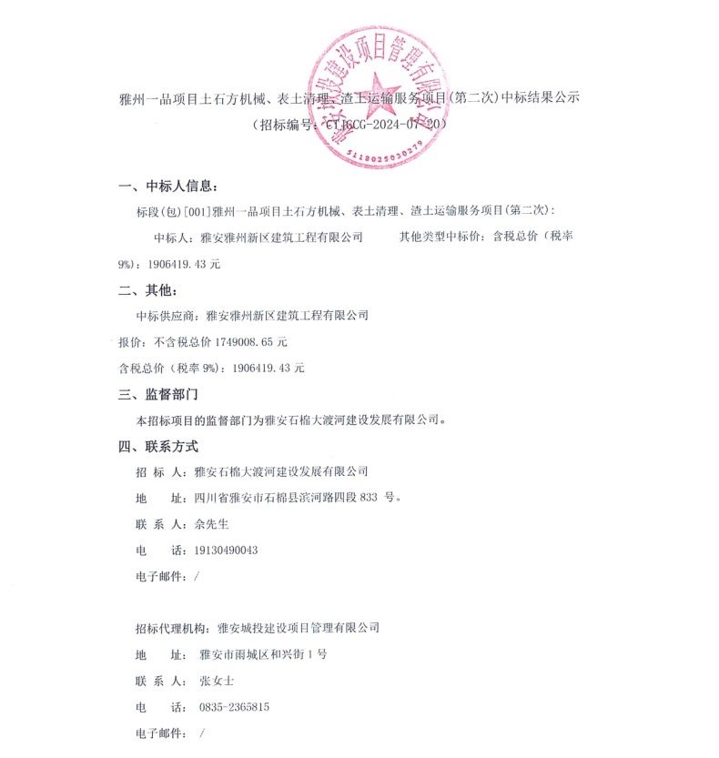 雅州一品項目土石方機械、表土清理、渣土運輸服務(wù)項目(第二次)中標結(jié)果公示