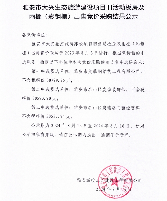 雅安市大興生態(tài)旅游建設(shè)項(xiàng)目舊活動(dòng)板房及雨棚(彩鋼棚)出售競(jìng)價(jià)采購結(jié)果公示